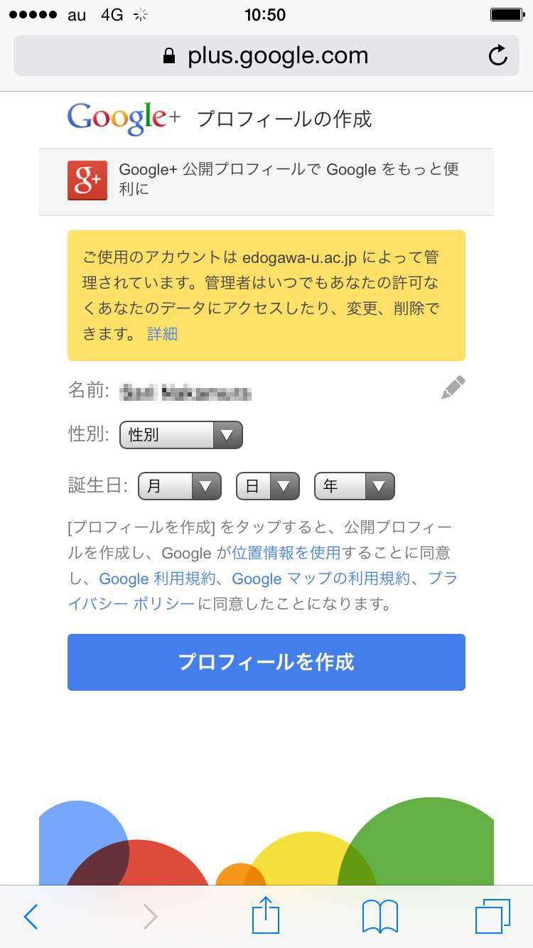 6.Google+のプロフィールを設定します。性別と誕生日を設定し、「プロフィールを作成」ボタンをタップします。
